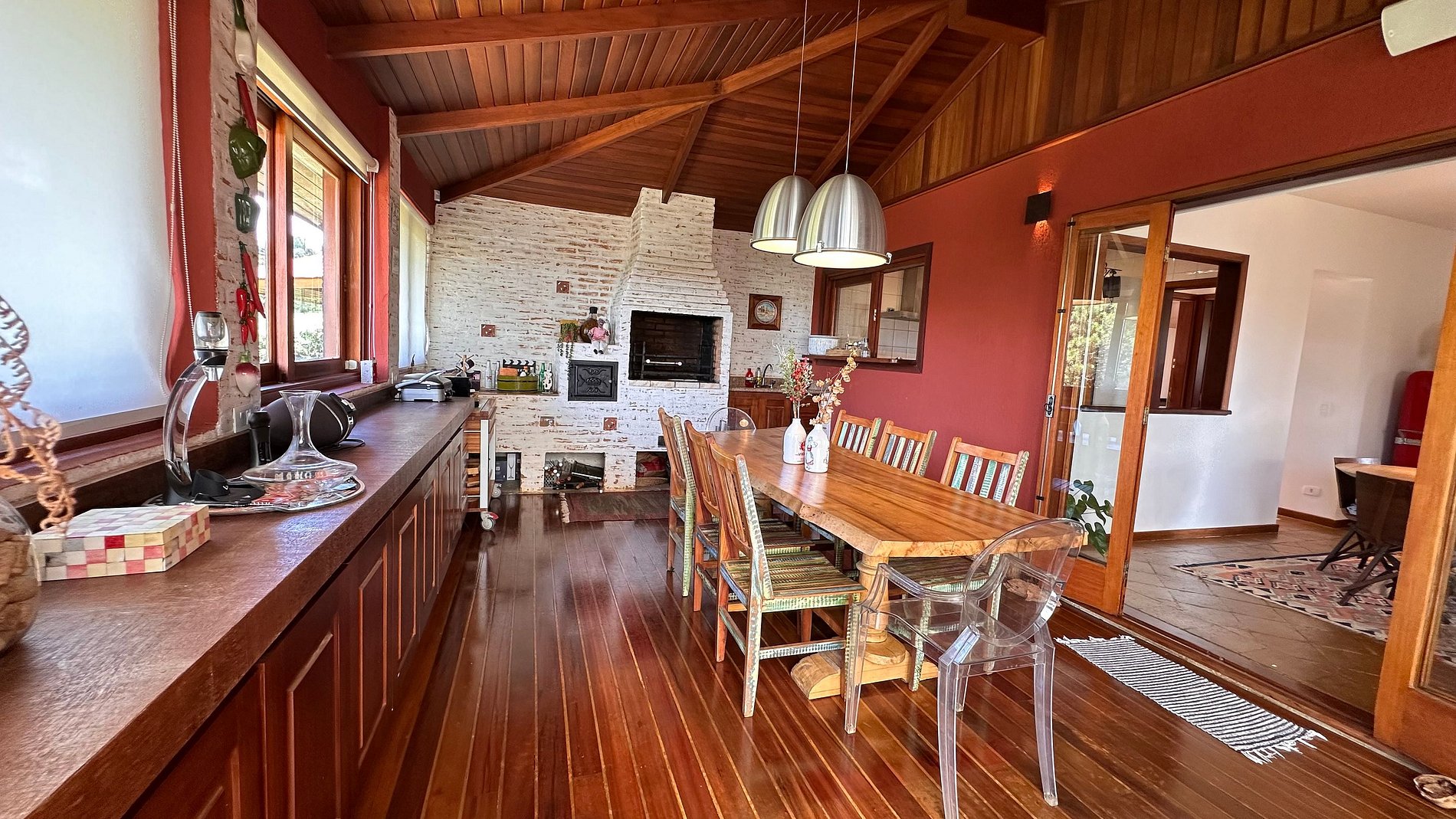 Nossa casa também oferece uma série de espaços comuns projetados para atender às necessidades de entretenimento e convívio social. A espaçosa sala de estar com lareira e TV ampla, é o local perfeito para reunir-se com amigos e familiares, enquanto a sala de jantar e área gourmet adjacente é ideal para desfrutar de refeições memoráveis integrada a nossa cozinha equipada.