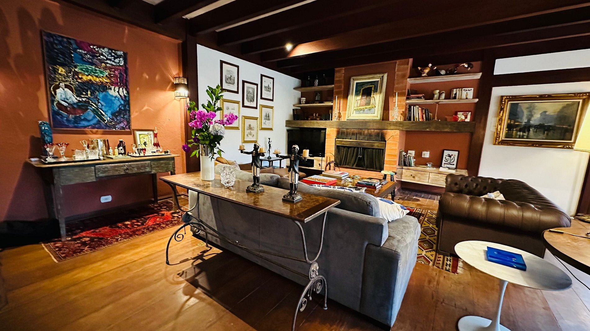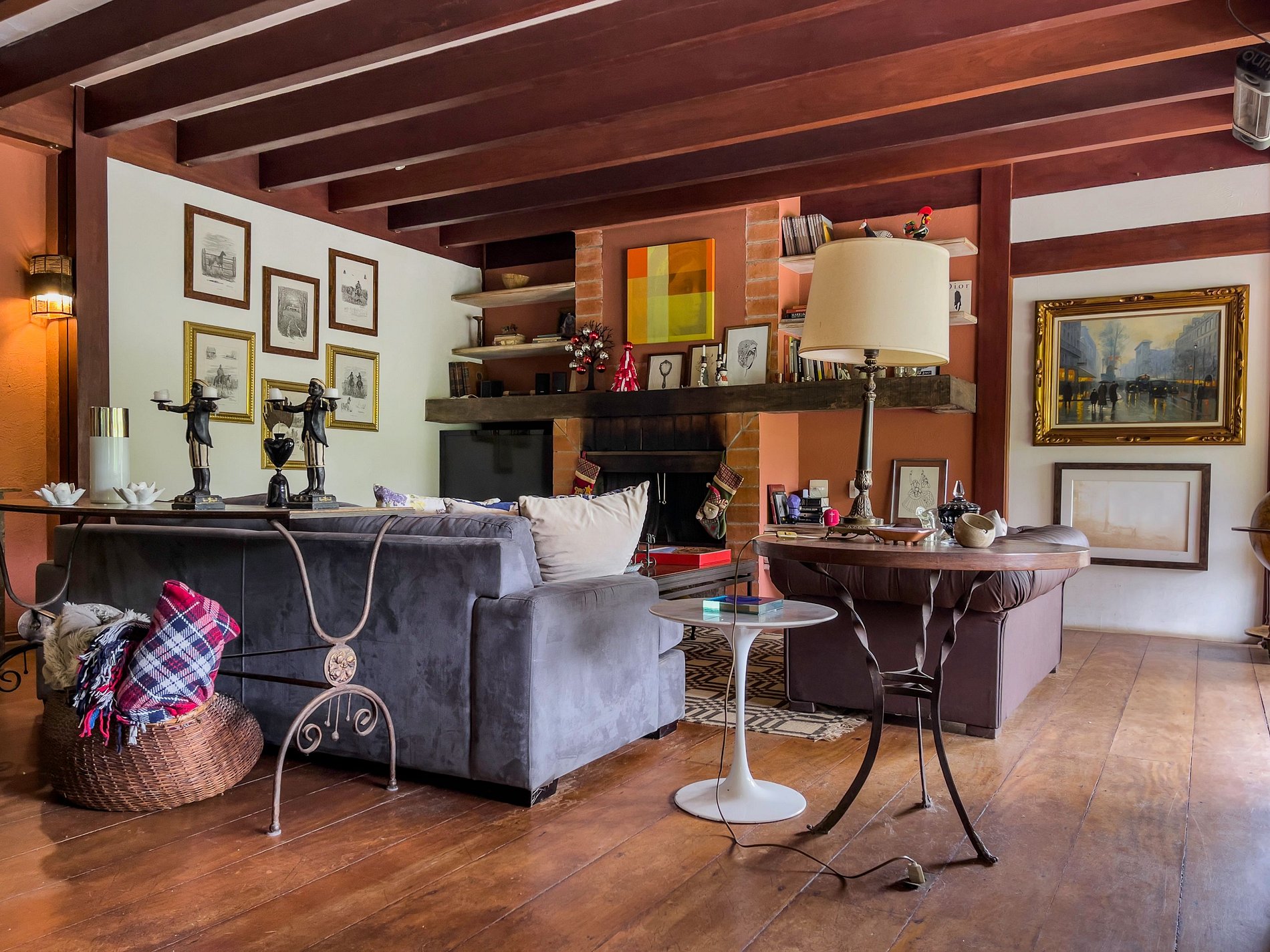 Sala de estar com lareira e aquecedores espalhados pela casa.
