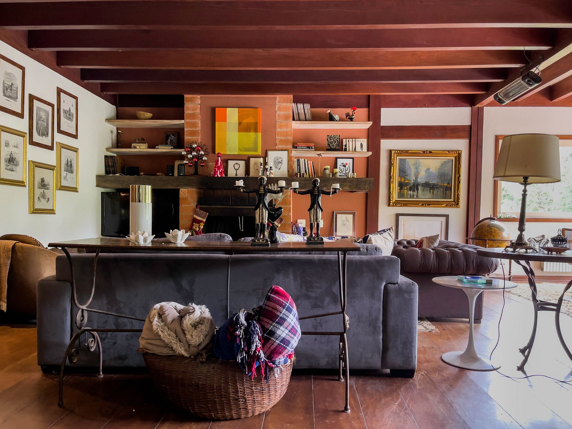 Sala de estar com lareira e aquecedores espalhados pela casa.