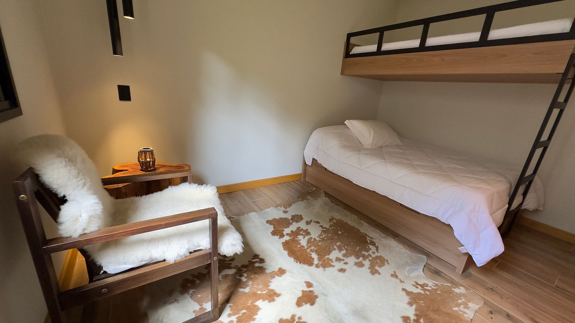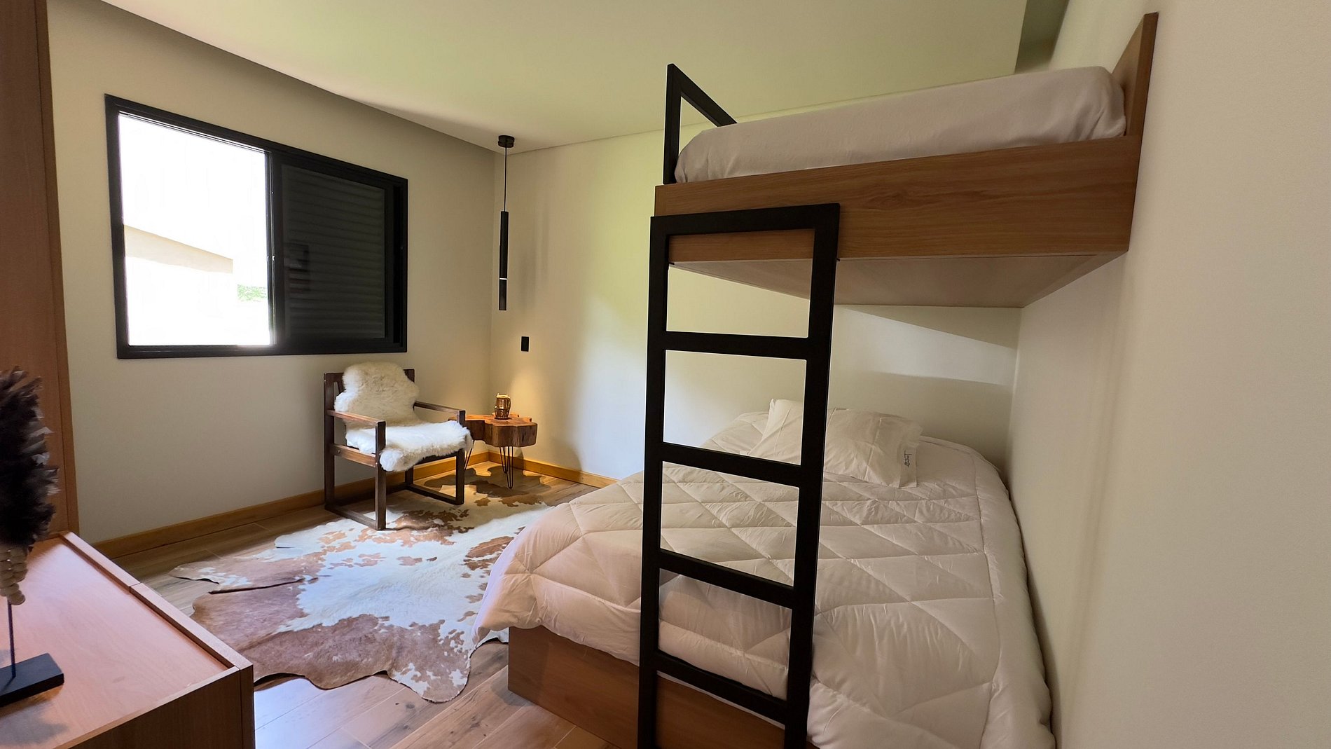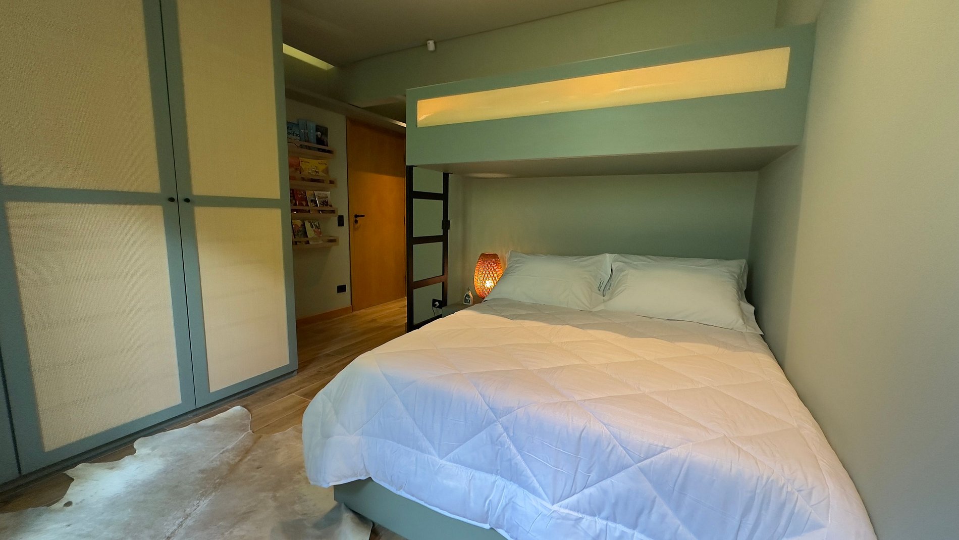 1 suite com cama de casal e acima 1 cama de solteiro